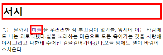 <h1>서시</h1> 죽는 날까지 <a href="https://ko.dict.naver.com/#/entry/koko/53c16c2b001d4beb9fe9c67ccd8d9064">하늘</a>을 우러러한 점 부끄럼이 없기를, 잎새에 이는 바람에도 나는 괴로워했다.별을 노래하는 마음으로 모든 죽어가는 것을 사랑해야지.그리고 나한테 주어진 길을걸어가야겠다.오늘 밤에도 별이 바람에 스치운다.