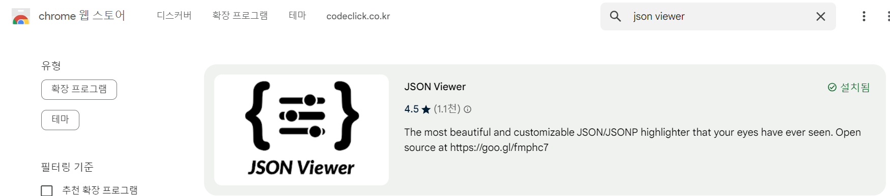 - 크롬 웹 스토어에서 `json viewer`로 검색해서 설치