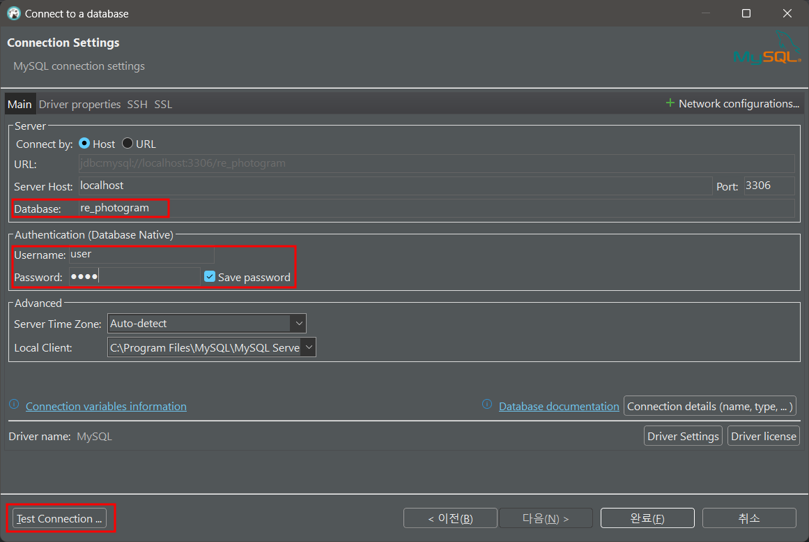 - 다시 `Test Connection` 버튼 클릭