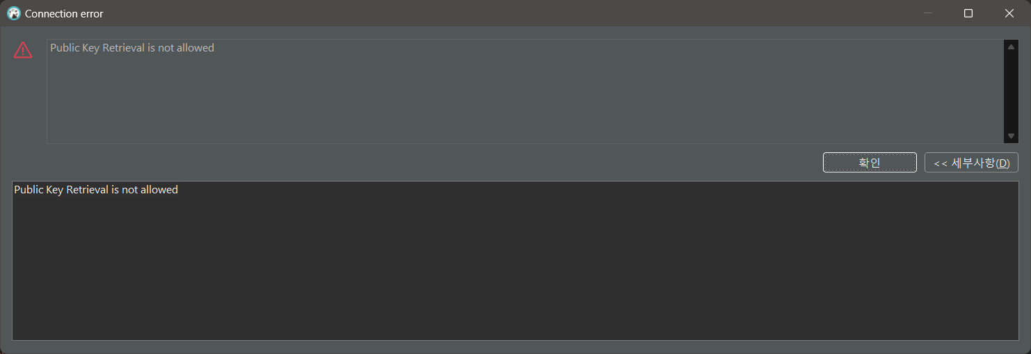 - 해당 오류는 MySQL 클라이언트가 서버로부터 공개 키를 가져오려고 시도했지만, 서버에서 해당 동작이 허용되지 않을 경우 발생한다고 함