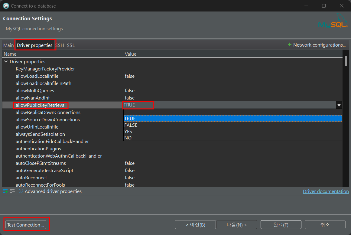 - 위쪽에 `allowPublicKeyRetrieval`이 있는데, false로 되어있는 것을 TRUE로 바꿈
