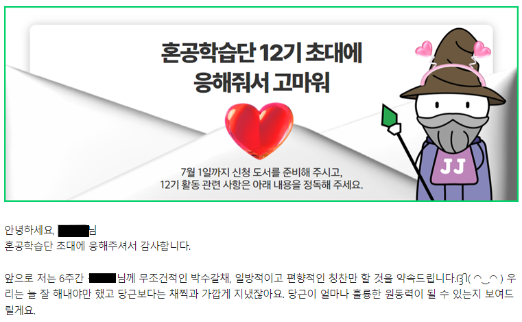 신청 이후에 시간이 흘러 흘러, 12기 참여 확정 메일을 받았다.