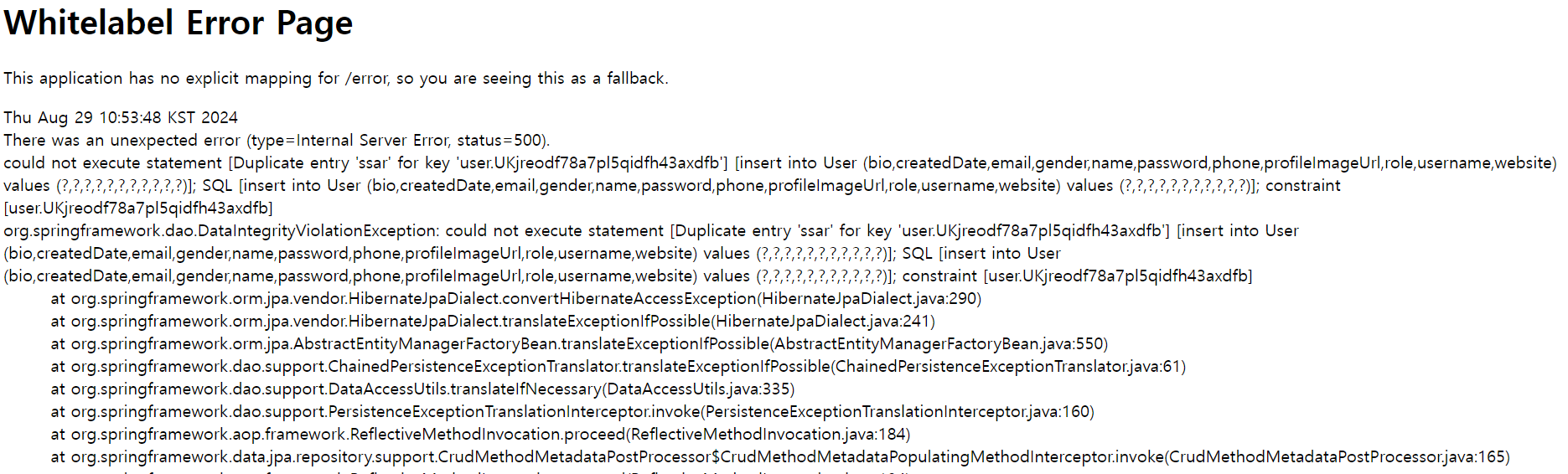 그리고 동일 `username`으로 가입을 시도하려고 하면, 위와 같이 [Whitelabel Error Page] 를 보게 된다.