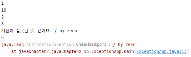 System.out.println("계산이 잘못된 것 같아요. " + e.getMessage()); // getMessage() <- error 원인 보여줌