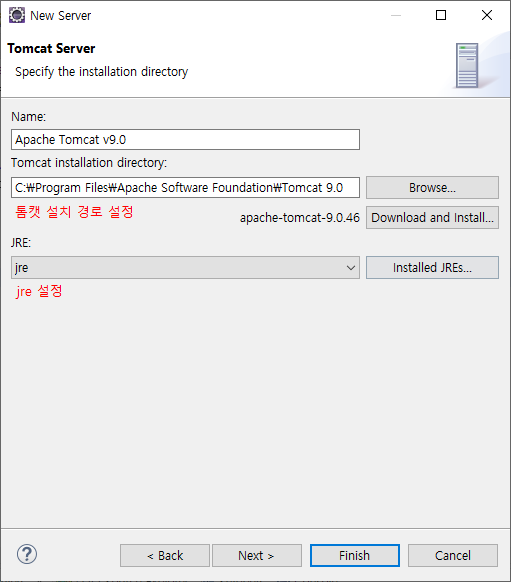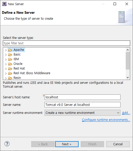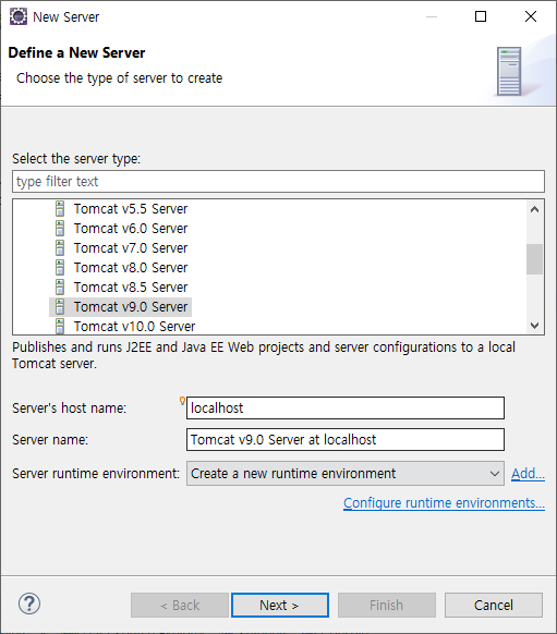 나는 톰캣 버전9를 설치했기 때문에, 내가 설치한 톰캣 버전을 선택한 후 next