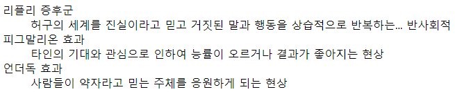 <dd>타인의 기대와 관심으로 인하여 능률이 오르거나 결과가 좋아지는 현상</dd>