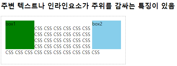 <h2>주변 텍스트나 인라인요소가 주위를 감싸는 특징이 있음</h2>