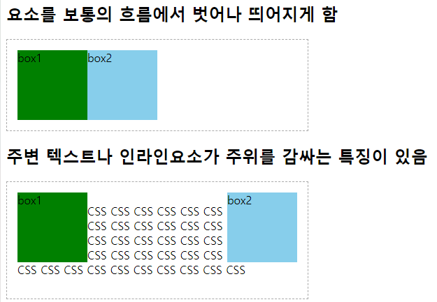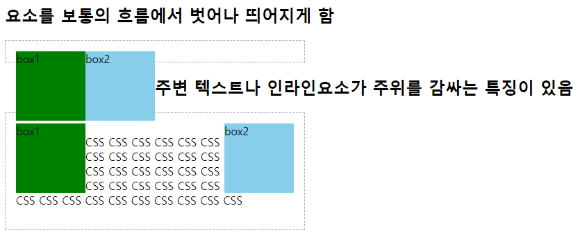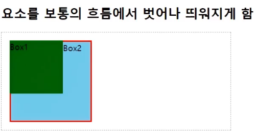 <h2>요소를 보통의 흐름에서 벗어나 띄어지게 함</h2>