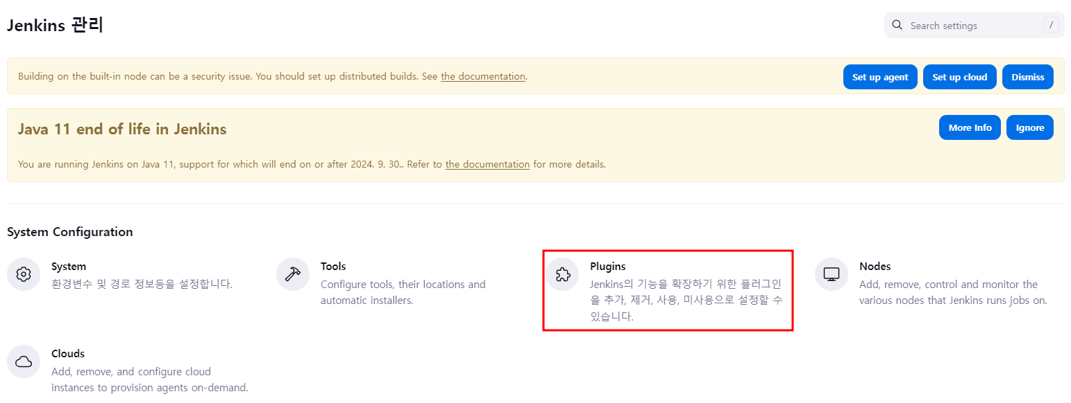 플러그인 설치는 Jenkins 관리에 들어가서!