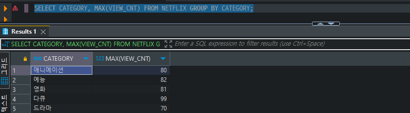 SELECT CATEGORY, MAX(VIEW_CNT), MIN(VIEW_CNT) FROM NETFLIX GROUP BY CATEGORY;