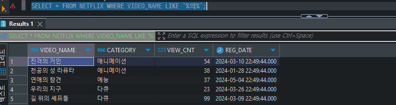 SELECT * FROM NETFLIX WHERE VIDEO_NAME LIKE '%의%';