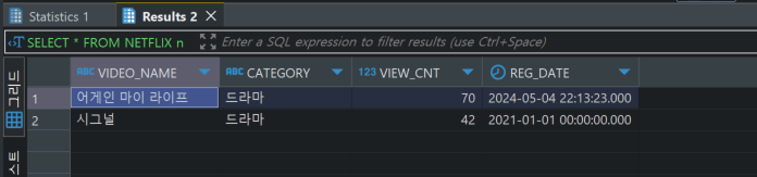 INSERT INTO NETFLIX n VALUES ('멜로가 체질', '드라마',30, SYSDATE-30);